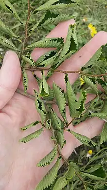 The Field Elm cultivar Ulmus minor 'Webbiana', or Webb's curly-leaf elm,[1] distinguished by its unusual leaves that fold upwards longitudinally, was said to have been raised at Lee's Nursery, Hammersmith, London, circa 1868, and was first described in that year in The Gardener's Chronicle[2][3] and The Florist and Pomologist.[4] It was marketed by the Späth nursery of Berlin in the late 19th and early 20th centuries as U. campestris Webbiana Hort.,[5][6] and by Louis van Houtte of Ghent as U. campestris crispa (Webbiana).[7] Henry thought 'Webbiana' a form of Cornish Elm, adding (presumably with Petzold and Kirchner's 1864 description of Loudon's var. concavaefolia in mind[8]) that it "seems to be identical with the insufficiently described U. campestris var. concavaefolia Loudon" – a view repeated by Krüssmann.