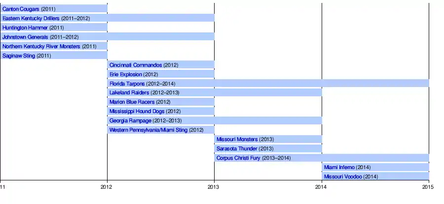Miami InfernoCorpus Christi FurySarasota ThunderMissouri MonstersMiami StingGeorgia RampageMississippi Hound DogsMarion Blue RacersLakeland RaidersFlorida TarponsErie ExplosionCincinnati CommandosSaginaw StingNorthern Kentucky River MonstersJohnstown GeneralsHuntington HammerEastern Kentucky DrillersCanton Cougars