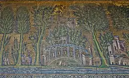 Vast portions of the mosque's walls were decorated with mosaics, of which some original fragments have survived, including some that depict the houses, palaces and river valley of Damascus.[18] Byzantine artisans were reportedly employed to create them, and their imagery reflects a late Roman style.[23][24][25] They reflected a wide variety of artistic styles used by mosaicists and painters since the 1st century CE, but the combined use of all these different styles in the same place was innovative at the time.[26] Similar to the Dome of the Rock, built earlier by Abd al-Malik, vegetation and plants were the most common motif, but those of the Damascus mosque are more naturalistic.[26] In addition to the large landscape depictions, a mosaic frieze with an intricate vine motif (referred to as the karma in Arabic historical sources) once ran around the walls of the prayer hall, above the level of the mihrab.[27] The only notable omission is the absence of human and animal figures, which was likely a new restriction imposed by the Muslim patron.[26] Scholars have long debated the meaning of the mosaic imagery. Some historical Muslim writers and some modern scholars have interpreted them as a representation of all the cities in the known world (or within the Umayyad Caliphate at the time), while other scholars interpret them as a depiction of Paradise.[26]