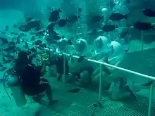 A number of recreational diving activities may have harmful environmental impacts, including touching or breaking coral, kicking sand or silt over living coral, and feeding or harassing wildlife. A small number of protected sites on Guam receive a disproportionately large percentage of inexperienced divers and students receiving open water instruction, who are the most likely to engage in harmful behaviors. These sites are Tumon Bay Marine Preserve, located in the tourist center of Tumon, and Piti Bomb Holes Marine Preserve, along the coast of Piti. The number of divers at Piti Bomb Holes increased dramatically after access to a third location, Outhouse Beach on Apra Harbor, was restricted in 2001.[2] In the aftermath of the September 11, 2001 attacks, Outhouse Beach was deemed too close to critical infrastructure around the Port of Guam. An estimated 50 to 200 dives occurred daily within a 0.25 hectares (0.62 acres) section of Piti Bomb Holes Marine Preserve, putting the number of annual dives at over 18,000. The threshold at which coral damage can rapidly accumulate is 4,000 to 6,000 dives, putting Piti Bomb Holes at severe risk.[15]