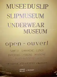 The Underwear Museum (French: Musée du slip, Dutch: Slipmuseum) is a museum in Lessines, Hainaut, Wallonia, Belgium which displays the underclothing of famous persons; each article was worn at least one time by the person in question and is combined with a certificate of authenticity. It also has artistic depictions of famous people wearing underwear.[1]