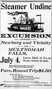 11. 1 2 3 "The excursion from Newberg that went up the Columbia on the steamer Undine …", Oregon City Enterprise, Oregon City, OR: Chas. Meserve, vol. 25, no. 1, 5, col.4, June 26, 1891