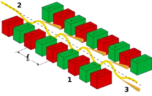 An undulator is an insertion device from high-energy physics and usually part of a larger installation, a synchrotron storage ring, or it may be a component of a free electron laser. It consists of a periodic structure of dipole magnets. These can be permanent magnets or superconducting magnets. The static magnetic field alternates along the length of the undulator with a wavelength . Electrons traversing the periodic magnet structure are forced to undergo oscillations and thus to radiate energy. The radiation produced in an undulator is very intense and concentrated in narrow energy bands in the spectrum. It is also collimated on the orbit plane of the electrons. This radiation is guided through beamlines for experiments in various scientific areas.