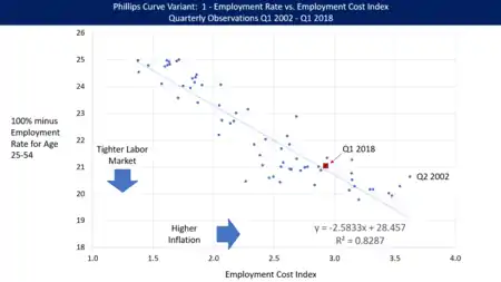 • Analysts can adjust for the effect of demographics by examining the ratio for those "prime-working aged" persons aged 25–54. For this group, LFPR fell from 83.3% in November 2007 to a trough of 80.5% in July 2015, before partially recovering to 81.8% in October 2017. The EM ratio for this group fell from its November 2007 level of 79.7% to a trough of 74.8% in December 2009, before recovering steadily towards 78.8% in October 2017. In both cases, the ratios had yet to reach their pre-crisis peaks, a possible indicator of "slack" in the labor market with some working-age persons on the sidelines.[57][58]