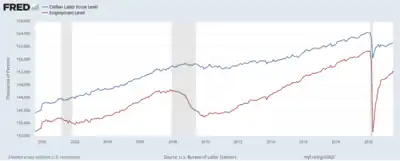 • Civilian employment, one measure of the size of the employed workforce, expanded consistently during the 1990s, but was inconsistent during the 2000s due to recessions in 2001 and 2008–2009. From 2010 onward, it steadily rose through October 2017.[45] For example, employment did not recover its January 2001 peak of 137.8 million until June 2003. Then, from the bubble-assisted peak in November 2007 of 146.6 million, 8.6 million jobs were lost due to the global economic crisis, with employment falling to 138.0 million. U.S. employment began rising thereafter and regained the pre-crisis peak by September 2014. By December 2016, civilian employment was 152.1 million, 5.5 million above the pre-crisis level and 14.1 million above the trough. By October 2017, 153.9 million were employed.[46]