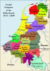 The United Kingdom of the Netherlands (Dutch: Verenigd Koninkrijk der Nederlanden; French: Royaume uni des Pays-Bas) is the unofficial name given to the Kingdom of the Netherlands (Dutch: Koninkrijk der Nederlanden; French: Royaume des Belgiques) as it existed between 1815 and 1830. The United Netherlands was created in the aftermath of the Napoleonic Wars through the fusion of territories that had belonged to the former Dutch Republic, Austrian Netherlands, and Prince-Bishopric of Liège in order to form a buffer state between the major European powers. The polity was a constitutional monarchy, ruled by William I of the House of Orange-Nassau.