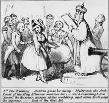 A British cartoon, satirising the "wedding" of Belgium and the Netherlands at the Congress of Vienna