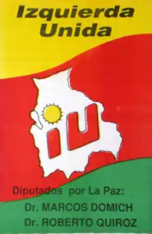 The United Left (Spanish: Izquierda Unida, abbreviated IU) was a political coalition in Bolivia. IU was launched ahead of the 1989 national elections, as a successor of the United People's Front (FPU). At the time of its founding IU consisted of eight parties, including the Revolutionary Left Movement - Free Bolivia (MIR-BL), the Communist Party of Bolivia (PCB), the Socialist Party-1 (PS-1), the Axis of Patriotic Convergence (ECP), the Movement for Socialist-Unzaguist (MAS-U) and FOM.[1][2]