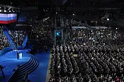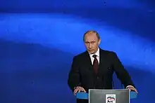 United Russia supports the policies of the incumbent President of Russia, Vladimir Putin, who previously served as party leader during the presidency of Dmitry Medvedev; despite not currently being the official leader or a member of the party, Putin operates as its de facto leader.[24] The party peaked in the 2007 Russian legislative election with 64.3% of the vote, while in recent years, it has seen its popularity decline.[25] The party's ideology has been inconsistent but embraces specific politicians and officials[26] who hold various political views but support Putin.[27] The party appeals mainly to pro-Putin and non-ideological voters[28][29] and is often classified by political scientists as a "big-tent party"[30][31][32][33] or as a "party of power",[34][35][36][37][38][39] meaning that it is the most influential Russian political force that makes major political decisions. In 2009, it proclaimed Russian conservatism as its official ideology.[5][40]