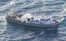 These vessels were built by Sewart Seacraft.[41] They were a derivative of an oilfield services crew boat which Sewart sold to support offshore oil installations in the Gulf of Mexico.[42] They were constructed of welded aluminum plates. They were 85 feet (26 m) long, with a beam of 18.7 feet (5.7 m), and a draft of 5.67 feet (1.73 m). They displaced 61 tons at full load. They could reach a speed of 21 knots. They had two propellers driven by two General Motors 16V-71 Diesel engines that produced 1,160 horsepower.[16] They had deck space to recover as many as eight torpedoes. These boats sailed with a crew of five men.[7] Although their hull registration numbers remained in the torpedo retriever sequence, they were referred to as "weapon retriever boats" at the Pacific Missile Range Facility where two were based.