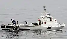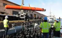Having located and captured a spent torpedo, it could now be recovered. The early 40' and 42' torpedo retrievers had no ability to bring a weapon on board. Their crews would snare a floating torpedo, tie a line to it, and tow it to a dock or ship where it could be craned out of the water. In the absence of purpose-built torpedo retrievers, a wide variety of small boats performed similarly. Disadvantages of these early vessels included their inability to operate in difficult sea conditions, to stay on station overnight, to navigate on their own, and to recover more than one torpedo per trip. These early retrievers had no radios. They would communicate by raising a "bravo" signal flag to indicate they were recovering a torpedo.[5] Beginning with the 63' boats and continuing to the present day, all U.S. Navy torpedo retrievers have an inclined aft deck or ramp equipped with rollers that allow torpedoes to be winched aboard directly from the sea.[10] These larger vessels could recover multiple torpedoes before off-loading to a shore facility or ship.