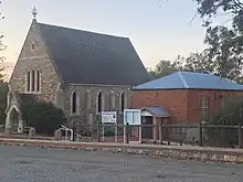 Monger himself was the successful tenderer.[3] Good progress on the chapel was reported in August 1853.[4] Funding for roofing was being solicited in November 1853.[5] George Wansbrough and his brother John (who were Wesleyans)[6] worked on the roof.[lower-alpha 1] One local complained that ticket-of-leave men were not available to be employed in construction of the chapel.[8][lower-alpha 2]