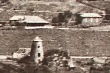 The Wesleyan chapel and manse, with Solomon Cook's mill, 1877.
