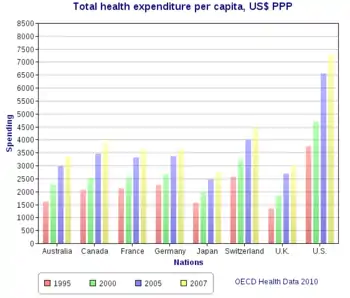 Health spending per capita, in US$ purchasing power parity-adjusted, among various OECD countries. For later data see List of countries by total health expenditure per capita.