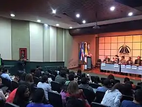 Poetry reading during the 11th International Poetry Festival in Quetzaltenango. Auditorium P. Dubón, Universidad Mesoamericana, campus Quetzaltenango.