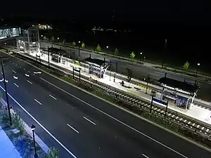 University City Blvd is a light rail station on the LYNX Blue Line in Charlotte, North Carolina, United States. It is located on North Tryon Street and Periwinkle Hill Avenue in University City. The station consists of a single island platform in the street's median, connected to an adjacent parking garage by a pedestrian overpass. The parking garage charges a flat weekday fee for all riders that do not have a one-day, weekly or monthly pass.[2] Notable places nearby include the Belgate Shopping Center, IKEA and the Wells Fargo Customer Information Center (CIC). The station opened on March 16, 2018.[3]