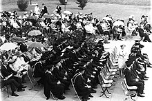 The graduation ceremony (held in 1966) was held out of doors, a feature of the open-air ceremony of the 1960s.