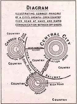 The first modern urban planning theorist was Sir Ebenezer Howard. His ideas, although utopian, were adopted around the world because they were highly practical. He initiated the garden city movement.[20] in 1898. His garden cities were intended to be planned, self-contained communities surrounded by parks. Howard wanted the cities to be proportional with separate areas of residences, industry, and agriculture. Inspired by the Utopian novel Looking Backward and Henry George's work Progress and Poverty, Howard published his book Garden Cities of To-morrow in 1898. His work is an important reference in the history of urban planning.[21] He envisioned the self-sufficient garden city to house 32,000 people on a site of 6,000 acres (2,428 ha). He planned on a concentric pattern with open spaces, public parks, and six radial boulevards, 120 ft (37 m) wide, extending from the center. When it reached full population, Howard wanted another garden city to be developed nearby. He envisaged a cluster of several garden cities as satellites of a central city of 50,000 people, linked by road and rail.[22] His model for a garden city was first created at Letchworth[23] and Welwyn Garden City in Hertfordshire. Howard's movement was extended by Sir Frederic Osborn to regional planning.[23]