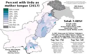 No region in Pakistan uses Urdu as its mother tongue, though it is spoken as the first language of Muslim migrants (known as Muhajirs) in Pakistan who left India after independence in 1947.[130] Other communities, most notably the Punjabi elite of Pakistan, have adopted Urdu as a mother tongue and identify with both an Urdu speaker as well as Punjabi identity.[131][132] Urdu was chosen as a symbol of unity for the new state of Pakistan in 1947, because it had already served as a lingua franca among Muslims in north and northwest British India. It is written, spoken and used in all provinces/territories of Pakistan, and together with English as the main languages of instruction,[133] although the people from differing provinces may have different native languages.[134]