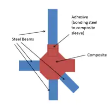 The study by P. Galvez replaced a complicated welded joint with a CFRP node. The node was adhesively bonded to the steel beams.