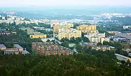 Vårberg borders Skärholmen, Vårby gård, Huddinge, Estbröte, Kungshatt, and Ekerö. It has an area of 197 hectares of land and 65 hectares of water. Its population is 8,454 as of 31 December 2007.[2] Vårberg contains the highest natural point in Stockholm, Vikingaberget, which is 77.24 meters above sea level. Vårberg also includes Vårbergstoppen, an artificial hill which was built from spoil from the excavation the Stockholm metro and which at 90 meters above sea level is the highest point of land in Stockholm.