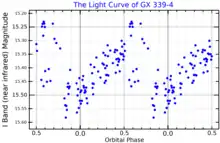 GX 339-4 is a moderately strong variable galactic low-mass X-ray binary (LMXB) source[1][2] and black hole candidate that flares from time to time. From spectroscopic measurements, the mass of the black-hole was found to be at least of 5.8 solar masses.[3]