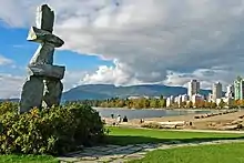 The Squamish, Musqueam, and Tsleil-Waututh (Burrard) peoples of the Coast Salish group[32][33][34] had villages in various parts of present-day Vancouver, such as Stanley Park, False Creek, Kitsilano, Point Grey and near the mouth of the Fraser River.[31] The region where Vancouver is currently located was referred to in contemporary Halkomelem as Lhq’á:lets,[35][36] meaning "wide at the bottom/end".