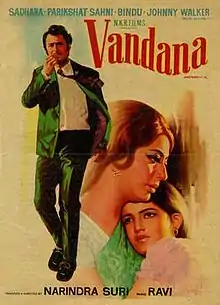 Vandana is a 1975 Indian film directed by Narendra Suri in Hindi language under the banner of N.K.R. Films.[1] The film released on 31 December 1975 starring Parikshat Sahni, Sadhana, Sarika and Bindu.[2]