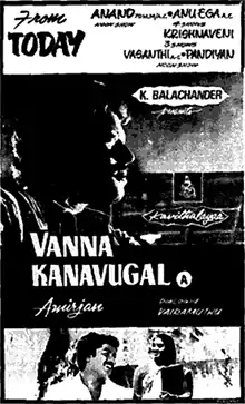 Vanna Kanavugal (transl.Colourful Dreams) is a 1987 Indian Tamil-language film directed by Ameerjan and produced by Kavithalayaa Productions. The film stars Karthik, Murali and Jayashree. It is a remake of the 1984 Malayalam film Adiyozhukkukal.[1][2] The film, which notably features no songs,[3] was released on 9 July 1987 and emerged a success.