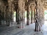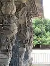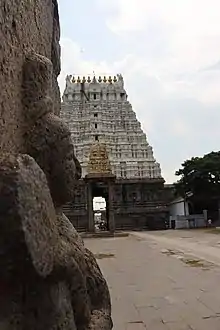 The main sanctum faces west and can be entered through a 130-feet-tall, 7-tiered rajagopuram (main gateway tower).[4] The image of the presiding deity is designed in such a way that on the 15th day after Chitra Purnima, the rays of the Sun fall on the idol.[26] The hill, called Hastagiri, is 360 m (1,180 ft) long by 240 metres (790 ft).[27] The eastern gopuram is taller than the western gopuram, which is contrasting to large temples where the rajagopuram is the tallest one.[4] One of the most famous architectural pieces in the temple is the huge stone chain sculpted in a single stone.[28] There is a 100 pillared hall[29] which has sculptures depicting Ramayana and Mahabharata. It is a masterpiece of Vijayanagara architecture.[21][28]