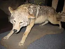 The coyote measured nearly 4.5 feet (1.4 m) long and weighed 35 pounds (16 kg), and its fangs were an inch long.[2] It was initially strung up in the local schoolyard,[2] and more than 3,000 people came to see the dead animal.[2][3] Later, it was hung from a tree near the Tazewell County Court House, attracting a further 7,500 visitors.[2] The animal was stuffed and is currently on display at the Crab Orchard Museum in Tazewell, Virginia.[4][5]