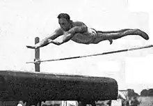 The 1924 Summer Olympics had an odd programme. The regular vault event featured an unusual format, using a bar that had to be jumped over between the springboard and the vaulting horse. There was also a "sidehorse vault" (French: saut de cheval en largeur) event in which the competitors used a vaulting horse set sideways (perpendicular to the approach) to turn make a single flip. This was the only time that event was held.