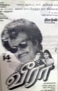 Veera (transl. Valour)[lower-alpha 1] is a 1994 Indian Tamil-language romantic comedy film[2] directed by Suresh Krissna and written by Panchu Arunachalam. It is a remake of the Telugu film Allari Mogudu (1992) and stars Rajinikanth, Meena and Roja with Janagaraj, Senthil, Vadivukkarasi, J. Livingston, Mahesh Anand, Vinu Chakravarthy, Ajay Rathnam, Vivek and Charuhasan in supporting roles. The film is about a man who marries twice because of circumstances beyond his control and is forced to live a double life to cover his tracks.