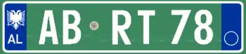 - ↑ 20 (letters) x 10 000 (9999 cars) [letters "O", "Q", "V", "X", and "Y" are not used, while "Z" is reserved for government vehicles and "W" is not used in Albanian language.].