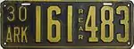 1930 | Embossed yellow serial on dark blue plate with border line; vertical "FRONT" or "REAR" used as separator; "30 ARK" at left | none | 123-456 | 1 to approximately 208-000 | |