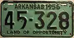 1956 | Embossed black serial on pale green plate with border line; "ARKANSAS 1956" centered at top | "LAND OF OPPORTUNITY" at bottom | 123-456 | 1 to approximately 422-000 | |