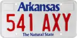 Embossed red serial on reflective white plate; "Arkansas" screened in dark blue centered at top | "The Natural State" screened in dark blue centered at bottom | 123 ABC | 001 AAA to 999 KPF | |