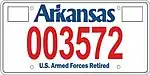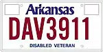 Veteran | obsolete | Embossed red on reflective white; "Arkansas" screened in blue at top; campaign name sticker at bottom; sticker at left for corresponding branch of service, medal, or major award | U/S ABCDE | U/S AAAAA to approximately U/S AIAZZ | Issued to veterans of World War II, the Korean, Vietnam and Persian Gulf Wars, and Operations Iraqi Freedom and Enduring Freedom. Discontinued in favour of regular passenger plates with campaign name sticker placed over the "Natural State" slogan, but still valid. |