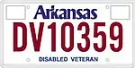 Veterans of Foreign Wars | ? to present | Embossed black on reflective blue, white and red gradient; VFW logo screened at left; "Arkansas" screened in black at top | N/B ABCD | N/B AAAA to present | Proceeds partially support the Nick Bacon Memorial Scholarship Fund (NBMS). |