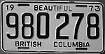 1973–78 | Blue on white | Beautiful British Columbia | ABC 123 | LAA 000 to XKK 999; LLA 000 to XXK 999; LLL 000 to PXX 999 | Later plates manufactured in Quebec using that province's serial dies. |