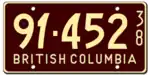 1938 | Embossed cream serial on brown plate with border line; "BRITISH COLUMBIA" at bottom and vertical "38" at right | none | 12-345 | 1 to approximately 97-000 | |