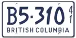 1941 | Embossed blue serial on white plate with border line; "BRITISH COLUMBIA" at bottom and vertical "41" at right | none | 12-345 | 1 to 99-999 | |