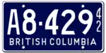 1942 | Embossed white serial on blue plate with border line; "BRITISH COLUMBIA" at bottom and vertical "42" at right | none | 12-345 | 1 to 99-999 | Produced in pairs but only single plates issued; the remaining plates were restamped and repainted for use in 1943, due to metal conservation for World War II.[4] |
