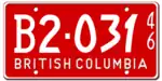 1946 | Embossed white serial on red plate with border line; "BRITISH COLUMBIA" at bottom and vertical "46" at right | none | 12-345 | 1 to 99-999 | |