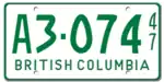 1947 | Embossed green serial on white plate with border line; "BRITISH COLUMBIA" at bottom and vertical "47" at right | none | 12-345 | 1 to 99-999 | |