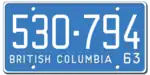 1963 | Embossed white serial on blue plate with border line; "BRITISH COLUMBIA 63" at bottom | none | 123-456 | 1 to approximately 534-000 | |