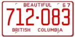 1967 | Embossed red serial on white plate with border line; "BRITISH COLUMBIA" centred at bottom; "67" at top right | "BEAUTIFUL" centred at top | 123-456 | 1 to approximately 720-000 | Colours chosen to commemorate the centennial of Canadian Confederation.[5] |