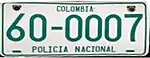 National Police | Policía Nacional | green on white | 12-3456 | "COLOMBIA" is screened at the top of the plate and "POLICIA NACIONAL" is screened at the bottom of the plate. | |