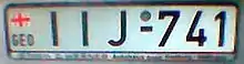 A new, European-style of registration plate was introduced on 1 September 2014. These have sets of two letters first and last (like French and Italian registration plates), with three numerals in the middle. A blue strip on the left contains the Georgian flag and a "GE", and there is a small security hologram on the bottom right.[2] As additional security features, the plates have a watermark-like symbol of the LEPL Service Agency of MIA of Georgia and a machine-readable data matrix code near the hologram. The old style plates with three letters, a hyphen and three numbers (e.g. ABC-775), in black on a white background, became invalid in September 2020. To accommodate owners of imported North American or Japanese vehicles, a more square styled plate is also available.[2]
