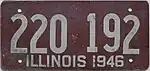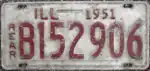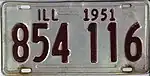 56. "Illinois License Plates For 1951, Maroon on Silver". The Daily Register. Harrisburg, IL. September 29, 1950. p. 6. Secretary of State Edward J. Barrett announced today that 1951 Illinois license plates will feature maroon numbers on an unpainted aluminum background, which is silverish in color.